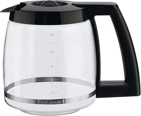 - 12-cup glass carafe holds 96 fluid ounces with ergonomic comfort grip black handle, dripless spout, lid, and knuckle guard.
