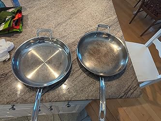 Pro: 10+ for induction cooking; 12″ size; very easy to clean; helper handle definitely a plus as this pan is on the heavy side; and the handles DO NOT get hot. I am getting rid of all my high end non-stick pans and going back to stainless. This pan doesn’t need high heat for good browning. Actually, you will burn everything if you use a high heat. Lids for my other 12″ pan fit this pan too.