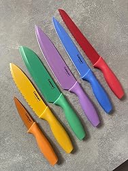 - ERGONOMIC HANDLE: In addition to the stylish, multicolored hues and matching blade guards, these premium stainless steel knives feature ergonomic handles for a comfortable grip.