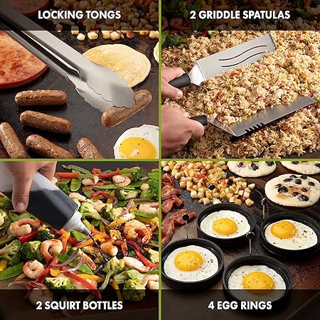 - INCLUDES: Set includes 2 griddle spatulas, flexible spatula, locking tongs, multi-purpose scraper, 6″ melting dome, 2 squirt bottles, and 4 silicone egg rings