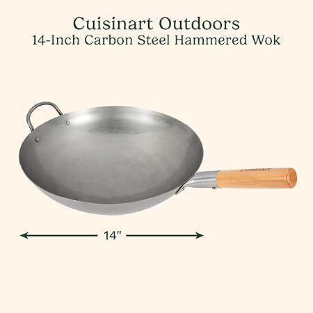 I’ve always trusted Cuisinart for their durable, well-made kitchen tools, and this 14” carbon steel wok definitely lives up to that standard. The material feels solid and built to last, and the hammered finish gives it a nice traditional touch. The size is perfect for cooking larger meals, whether I’m stir-frying or deep frying—it holds plenty without feeling too bulky to handle.