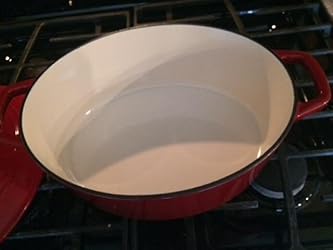 I love it, love it!!! It’s beautiful red color, and very good quality. It came really well packaged though it did not arrive in the 2 day Prime window. I did not season, but have used many times with no problem. I made Chicken Masala and it turned out delish. It was great becasue everything cooked evenly and it was a one pot dinner. I hand washed it but could prob just as easily put it in dishwasher. My only complaint, is that it is soooo heavy, I did not realize how big it really is–but it’s a good thing too becasue you can cook a whole chicken in this easily with all the side trimmings. I also saw you can make bread in it, can’t wait to try that. I like it that it’s oval but it’s hard to fit on my circular range, though it still heats evenly. It goes from stove top to oven so easily, I just need my husbands help sometimes becasue I get paranoid that I might drop it. My other issue is I have a glass top stove that I struggle cooking with this on, with it being so big and oval, I have a hard time moving it around and not scratching the surface of my stove top. I am looking forward to growing my collection of other pieces.