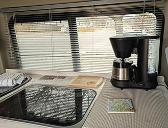 This coffee maker is perfect in our RV. Takes up very little room and looks great! It makes exactly two large cups of coffee. Which is perfect for two people.