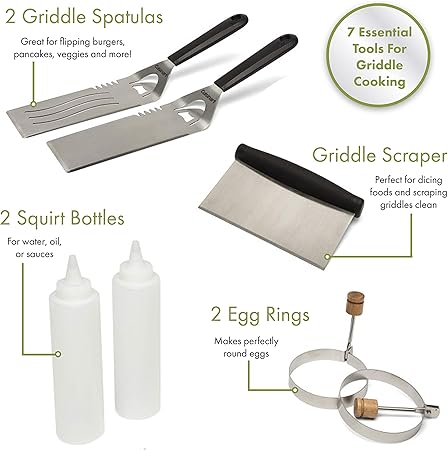 - SEVEN ESSENTIAL TOOLS FOR GRIDDLE COOKING: Two spatulas, two squirt bottles, two egg making rings, and a griddle scraper give you restaurant quality tools at home all featuring comfortable handles won’t absorb oil or moisture.