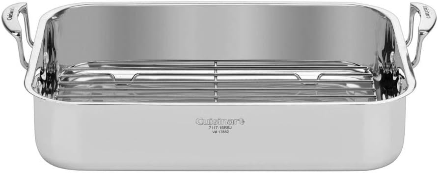 This beautiful, roasting pan has worked perfectly every time. Beautifully crafted with handles and sturdy rack make it very easy to use. Cleans easily and restores to lovely shine! Researched many before deciding on this one.