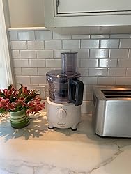 This is a powerful little food processor. I got the 8 cup one, which is big enough for a 2-person household. Because it is round, it has a small 7.5″ by 7.5″ footprint, although the handle of the mixing bowl sticks out another 2 inch or so. It comes with three chopping/slicing devices, a stainless steel chopping blade, a reversible thin shredding and slicing disk, and a reversible thick shredding and slicing disk. I have grated carrots, parmesan cheese, and apples with it, and used the chopper and the slicers, too. All work well and do what they are supposed to do. The motor does not seem to mind when you let it run for a while, and it does not start to smell. It is easy to clean, either by hand or in the dishwasher. The only issue, typical for rotating disk slicer and grater, is that the end piece of whatever you slice or grate will be left and not go through the grater or slicer. But that’s a technical issue that can’t be resolved because there needs to be a bit of a gap between the bottom end of the pusher for the feeding tube. And that gap is where the end piece will go to, rather than getting grated or sliced. Thus, you’ll have the same problem with the more expensive food processors.