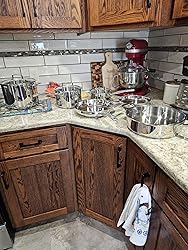 I love this cooking set. It’s beautifully designed the lids could use a bit of modification though because it would be much more convenient if they hung off the handles like some other sets I’ve seen, but the stacking feature makes up for this. There is one learning curve I’ve found that maybe helpful. The cooking pans and pots will get discolored time to time from use but invest in some bar keepers friend and boom there like new once more shiny and pristine. I donated my last set to goodwill after I got this one and don’t regret it. They are easy to clean, save storage space, and look fabulous!