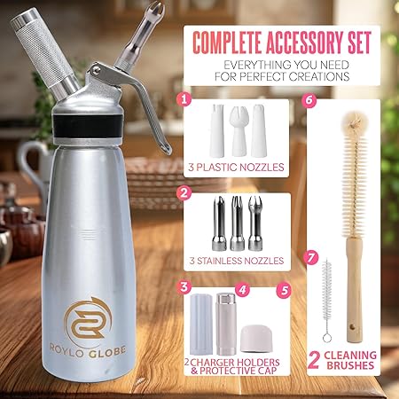 - VERSATILE DECORATING TOOLS: Equipped with 3 stainless steel and 3 plastic nozzles, our cream whipper unlocks endless possibilities for decorating various dishes. Whether you’re aiming for intricate swirls or delicate rosettes, these easy-to-change nozzles cater to all your creative needs. The whipped cream maker kit’s versatility is enhanced with a charger holder and detailed instruction manual, ensuring a safe and enjoyable experience for culinary experts.