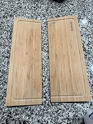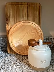 The curved cutting board is smooth, with beautiful wood grain. It’s 10 inches in diameter, sturdy, and a rounded 1.25 inches thick. It looks like a work of art and makes using the curved blade easy. An excellent tool that looks good on the countertop.