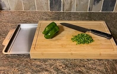 I've always liked my Cuisinart products so I gave this a try and it does not disappoint! The board is a good size and feels like a good quality cutting board. The hidden tray does slide easily and can be a little bit of an awkward nuisance at times, but certainly not a problem while you're using the board. It's a nice bonus to have and will come in quite handy when cutting veggies for the grill. Due to the space provided for the tray you can feel that the board is thin (hollow) as you cut, but this does not cause any issues, though. You're probably not likely to use the tray every time, but it's definitely nice to have for those times you need it!