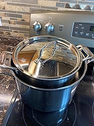 Awesome large Cuisinart MultiClad stockpot! Same construction type as Allclad. The 12 qt is an awesome addition to the set we got when married, but Our biggest pan was only 8 qt. The 12 qt is 11.5” wide by 7.5” tall. This will stack for storage, the 8 qt is 10” wide.